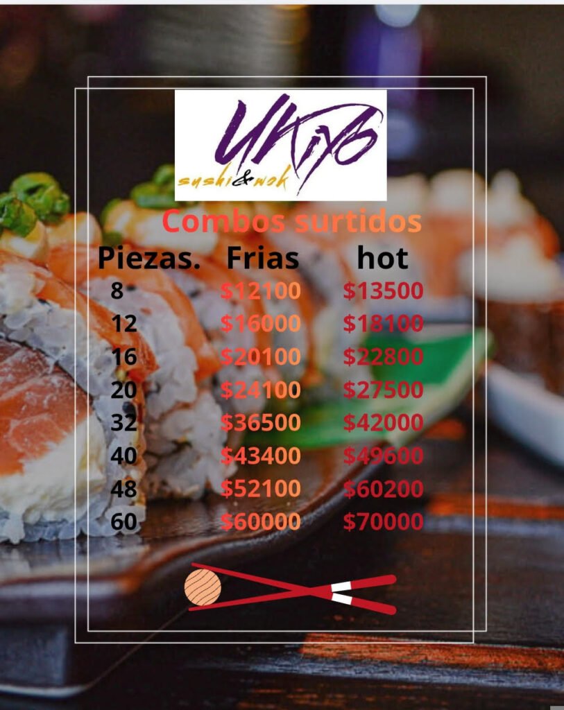 8 New York Roll, 8 Philadelphia Roll, 8 Salmón Party Rolls, 8 Salmón Tropical Roll, 8 Sashimi, 6 Niguiris, 6 Geishas.